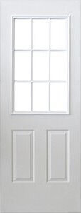 Puerta de Acero diseñada con 9 Luces o 9 Vitrales pequeños que forman una ventana rectangular en la parte media superior de la puerta.